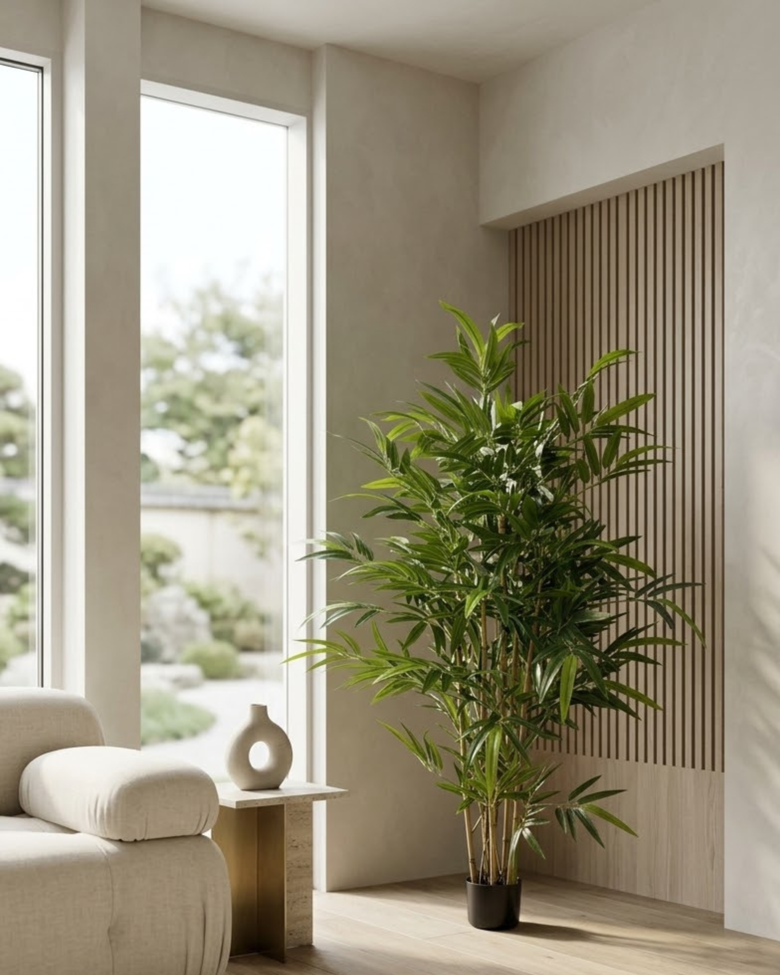 Perfect for homes, offices, hotels, restaurants, and commercial spaces, this artificial bamboo tree adds height, texture, and a sophisticated touch — all without the maintenance required by live plants.
