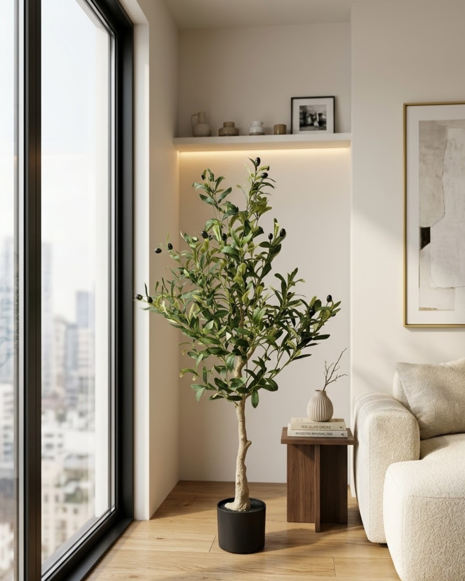 Bring a soft, organic touch to your décor with this Artificial Olive Tree. Designed with slender, silvery-green leaves and delicately detailed branches, it beautifully captures the elegance of a real olive tree. The natural-looking trunk enhances its authentic appearance, creating a warm and timeless aesthetic.