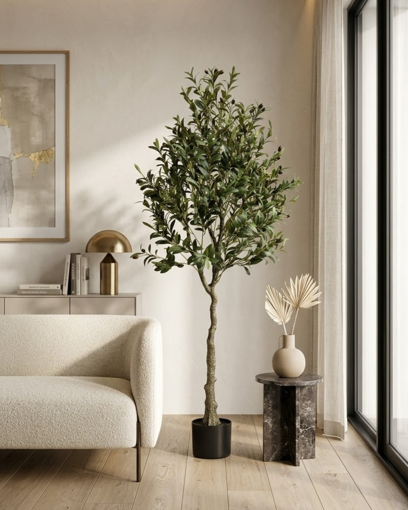 Bring a soft, organic touch to your décor with this Artificial Olive Tree. Designed with slender, silvery-green leaves and delicately detailed branches, it beautifully captures the elegance of a real olive tree. The natural-looking trunk enhances its authentic appearance, creating a warm and timeless aesthetic.
