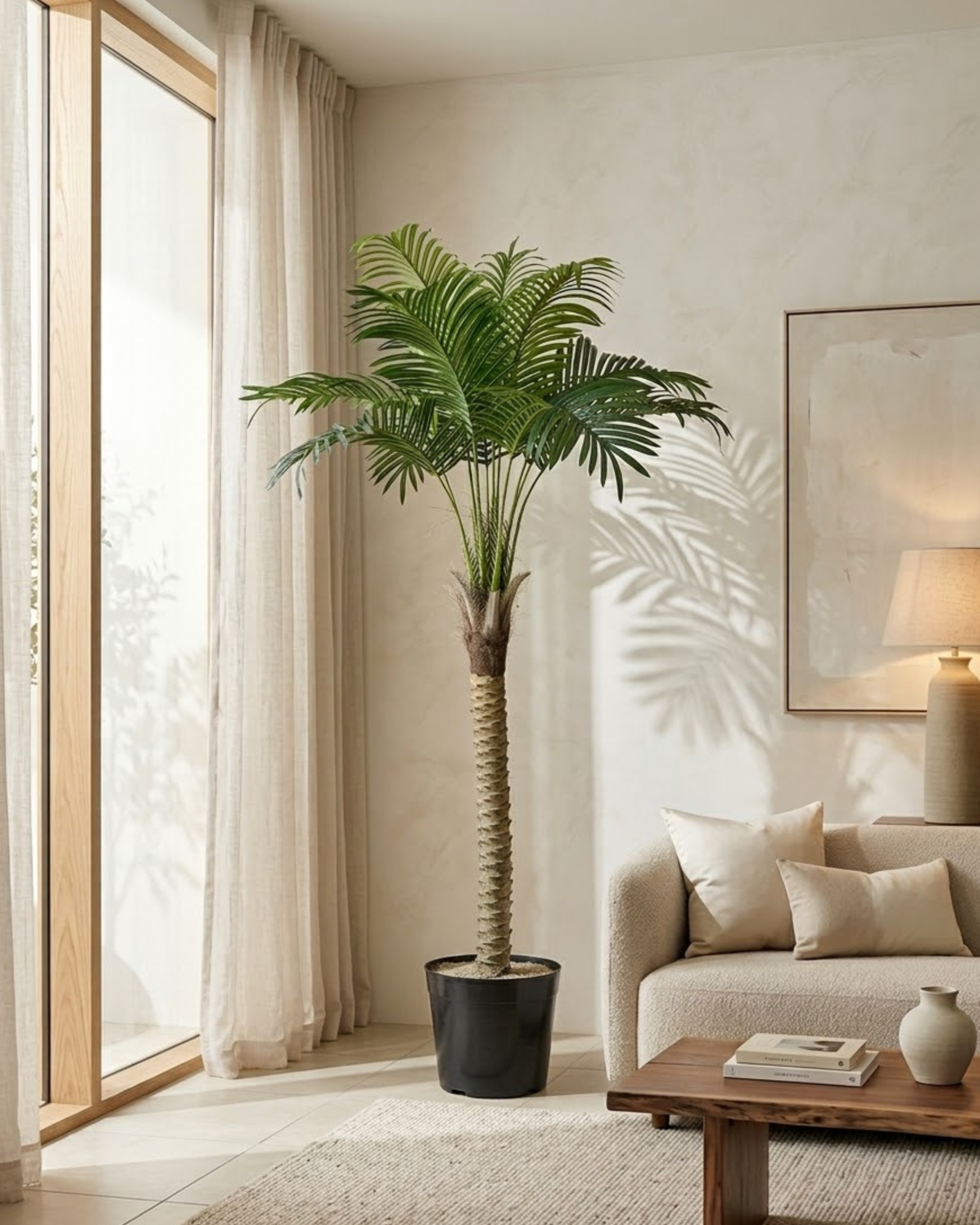 Perfect for living rooms, offices, hotels, showrooms, and reception areas, this elegant tree adds height and tropical style to any interior. Crafted from high-quality, durable materials, it maintains its vibrant appearance all year round without watering, pruning, or sunlight.