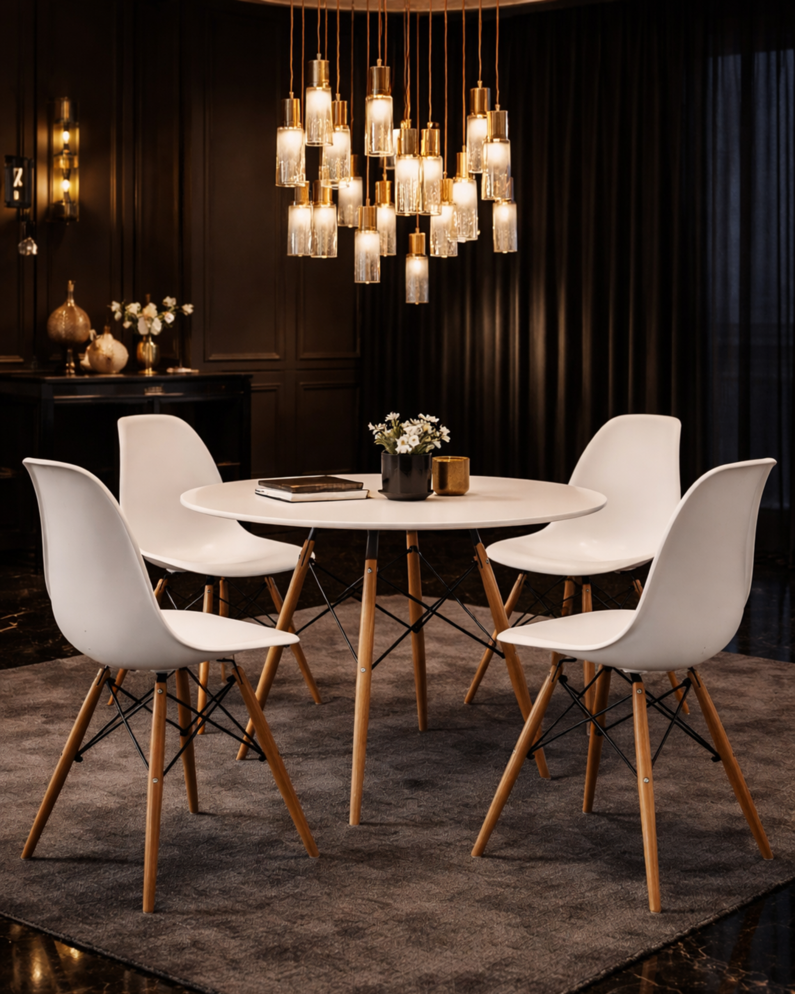 Paired with the table, the Modern Eiffel Leg Chairs feature a sleek molded plastic seat designed for comfort and style, supported by sturdy wooden legs with metal cross supports. This iconic Eiffel-style base provides excellent stability while adding a designer touch to modern interiors. The ergonomic design ensures comfortable seating for daily use.